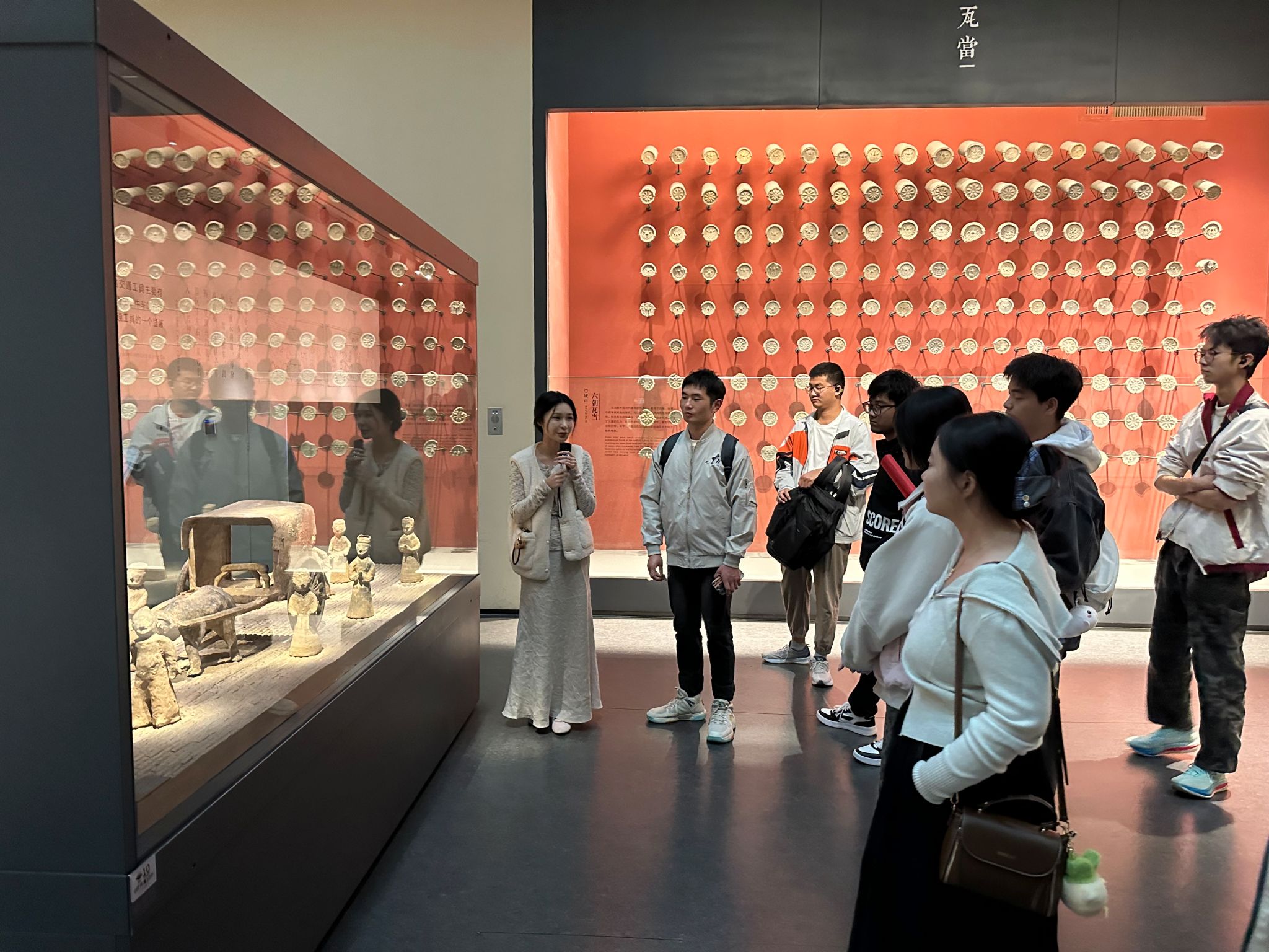 在博物馆专业讲解员的引导下,大家依次参观了“六朝帝都”“回望六朝”“六朝风采”“六朝人杰”四大展厅。步入“六朝帝都”展厅,一组动态复原的六朝建康城地图吸引了众人目光,讲解员结合文献记载与考古发现,详细介绍了建康城的城市布局、宫殿建筑与市井生活,让同学们直观感受到南京作为“六朝古都”的历史地位。
