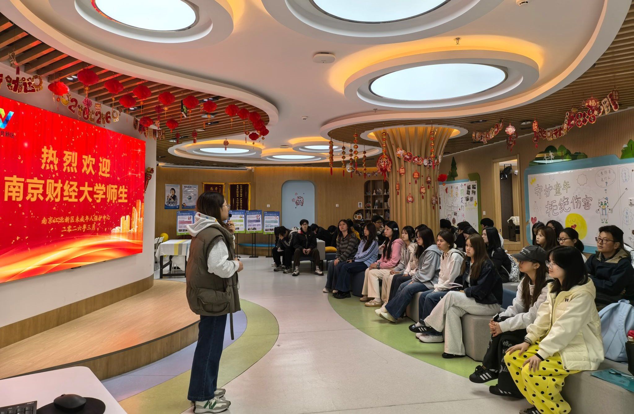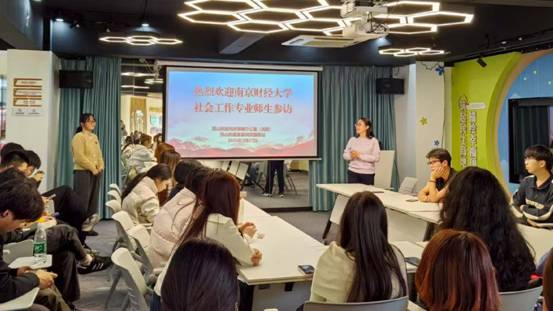 参访首站来到江北新区未成年人保护中心。该中心由南京同心未成年人保护与服务中心运营,2022年9月建成投用,内设儿童服务区、图书角、法治帮教区等功能空间,面向辖区困境、留守、流动儿童提供健康体检、心理疏导、女童保护、司法帮教等多元服务。社工李欢、雷妤围绕未成年人保护政策、阵地运营、公益项目、志愿见习岗建设等内容进行细致讲解,并分享江北新区原创公益歌曲《为爱护航,江爱唱响》,让我院师生全面了解未成年人保护工作体系与服务模式,现场还发出实习邀请,鼓励同学们投身一线未成年人保护实践。