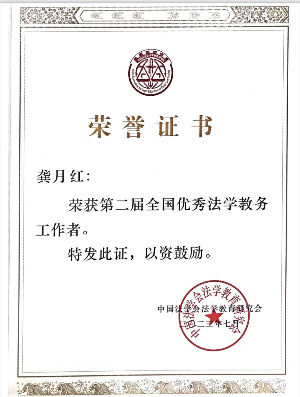 近日,为了总结经验,表彰先进,充分发挥全国优秀法学教务工作者的积极示范作用,推动法学教务工作不断取得新成效,中国法学会法学教育研究会开展了第二届“全国优秀法学教务工作者”评选表彰活动。经过单位推荐、专家评审、研究会会长会议审议、网上公示等环节,我院龚月红老师光荣入选。