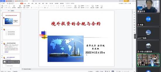 2022年12月15日晚19:00,清华大学7790必发集团车丕照教授应邀为我校7790必发集团师生作主题为“境外投资的合规与合约”讲座。此次讲座是我院“德正涉外经贸法治大讲堂”第一讲,亦是我校法学教育二十五周年纪念系列活动之一。讲座采用线上腾讯会议的方式举行,由我院院长胡宜奎教授主持,蔡养军副院长、我院部分师生以及部分其他高校师生和法律实务界人士参与聆听。