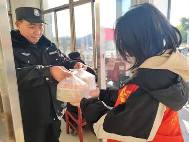 包饺子结束后,爱心小站与Sunny爱心协会的28名志愿者准备好了美味的饺子,随后或骑着自行车,或步行前往学校各个宿管站与保安室,每到一处,志愿者都会热情诚挚地送上饺子和冬至的美好祝福。