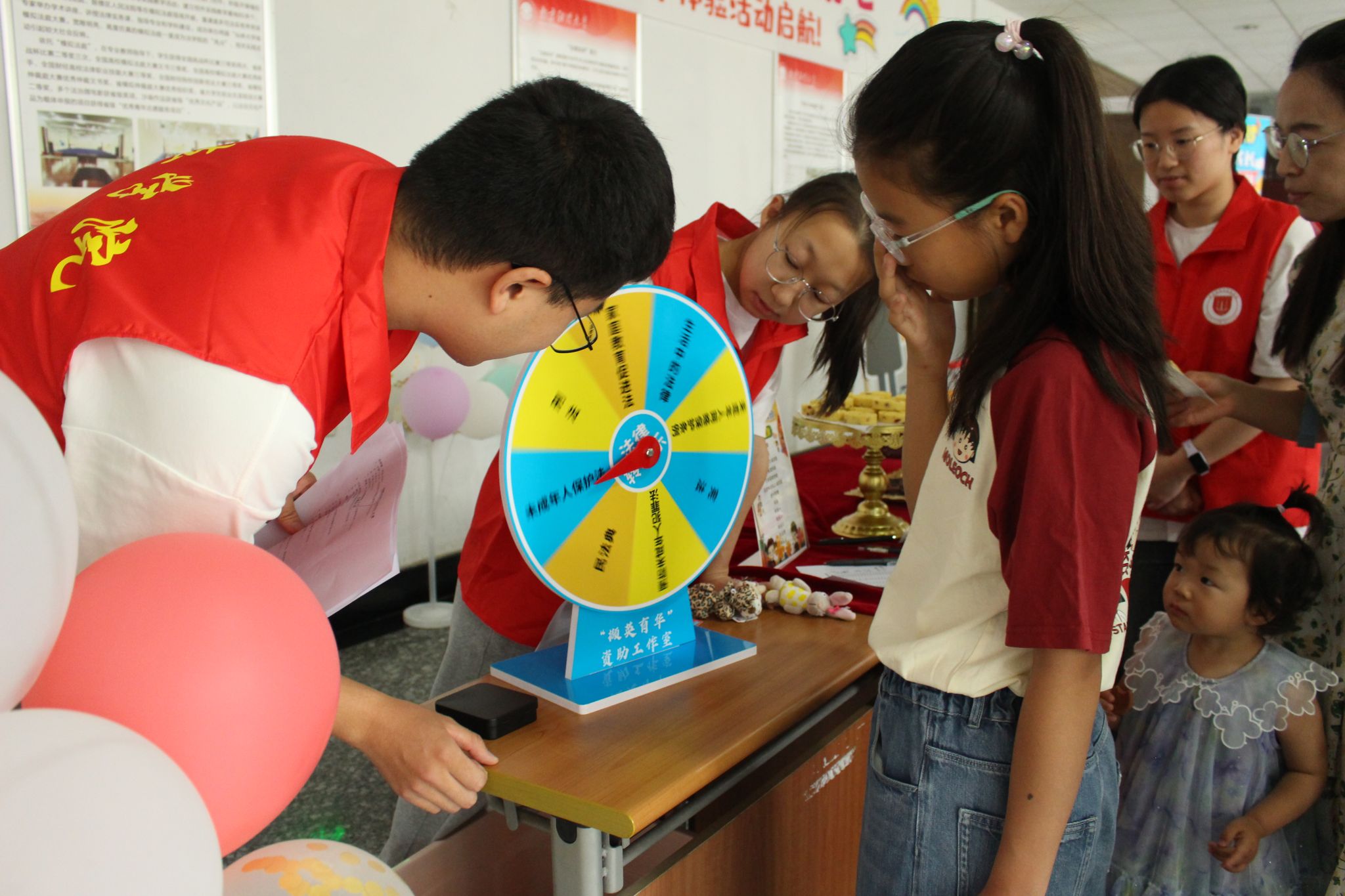 活动伊始,“法律知识大转盘”区域便吸引了众多孩子踊跃参与。孩子们转动缤纷的转盘,指针随机停驻在“未成年人保护”“交通安全”“网络安全”等主题区域。在家长与普法志愿者的引导下,孩子们积极参与法律小问答,在轻松的游戏氛围中悄然理解了规则意识的重要性。
