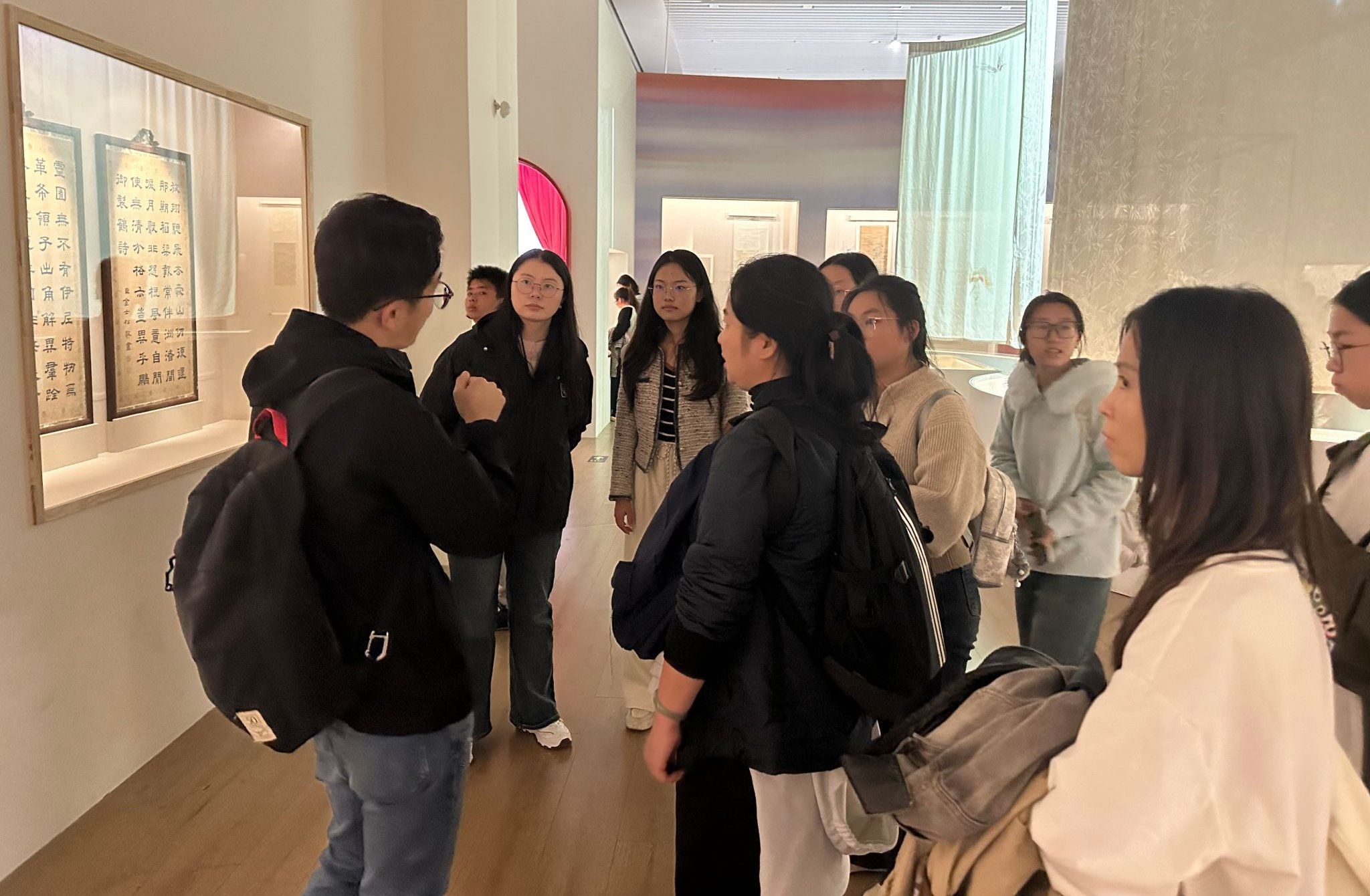 步入展厅,芙蓉石蟠螭耳盖炉的温润粉红、珐琅叠翠的灵动青绿、新石器时代彩陶钵的古朴赭红交相辉映,一件件承载传统色彩美学的展品,以独特的文化语言诉说着中华文明的璀璨过往,成为民族文化基因的“鲜活载体”。在讲解员引导下,同学们沿着色彩脉络探寻历史,从古代工艺中的匠心传承,到传统美学里的精神内涵,每一处细节都引发大家对“文化自信的底气”“青年一代在文化传承中的角色定位”以及“如何将传统智慧融入时代使命担当”的深度思考。