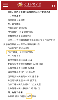 近日,省委宣传部、省文明办、省教育厅、团省委、省学联联合下发了《关于公布2023年全省大中专学生志愿者暑期文化科技卫生“三下乡”社会实践活动先进集体和个人名单的通知》(团苏委联〔2023〕20号),对2023年江苏省暑期“三下乡”社会实践活动进行了总结表彰。我院“与宁携手,情暖凉州”团队获评“优秀团队”,社会工作系主任许芸副教授获评“先进工作者”。