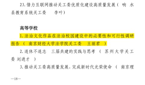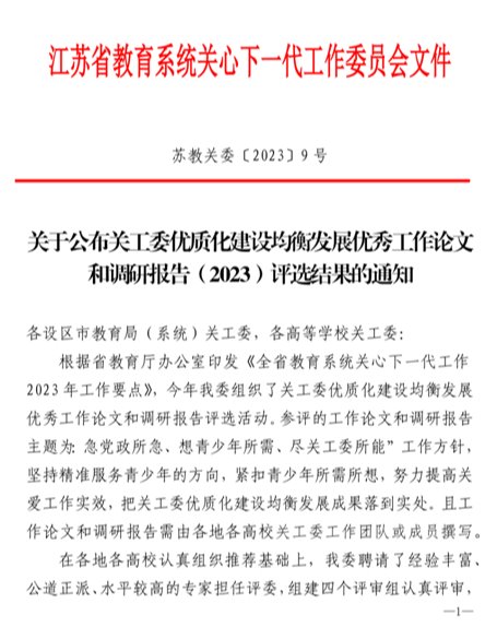 近日,省教育系统关工委印发《关于公布关工委优质化建设均衡发展优秀工作论文和调研报告(2023)评选结果的通知》,在以上活动评选中,我校获得三项奖励,其中我院学工办主任王丽君老师报送的《法治文化作品在法治校园建设中的必要性和可行性调研报告》,获评省教育系统关工委优质化建设均衡发展优秀工作论文三等奖。