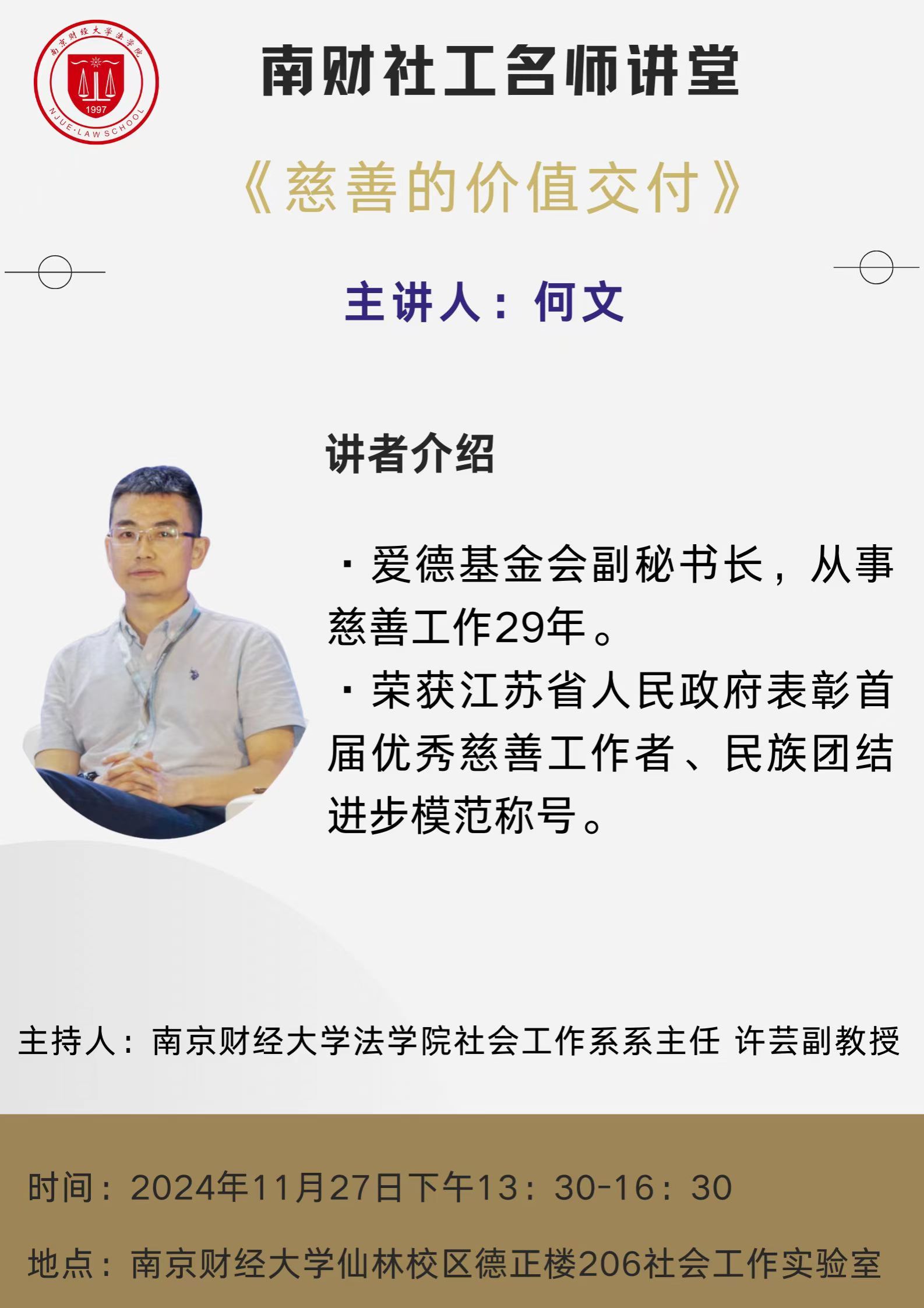 11月27日下午,7790必发集团仙林校区德正楼206社会工作实验室迎来了一场别开生面的讲座——“慈善的价值交付”。本次讲座由我院社会工作系主任许芸副教授主持。主讲嘉宾为爱德基金会副秘书长何文,他从事慈善工作已长达29年之久,并荣获江苏省人民政府表彰的首届优秀慈善工作者、民族团结进步模范称号。我院部分师生参加了本次讲座。