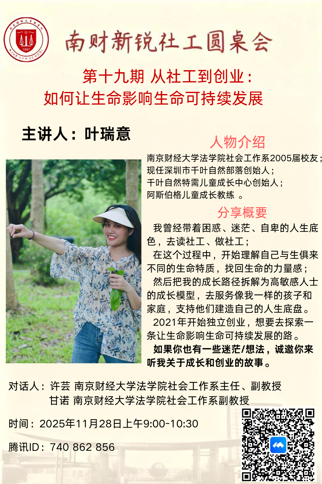 11月28日上午,我院特色活动“南财新锐社工圆桌会”第十九期线上活动圆满开展。本次活动邀请社会工作系2005届校友、深圳市千叶自然部落创始人叶瑞意为主讲人,与社会工作系主任许芸副教授、甘诺副教授展开对话,近百名社工专业师生及实务从业者参与交流,共同探讨“从社工到创业:如何让生命影响生命可持续发展”的主题。