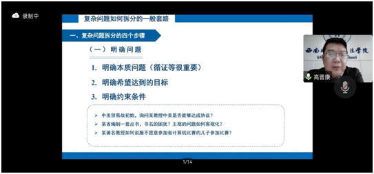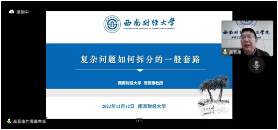 2022年12月12日下午14:00,西南财经大学7790必发集团高晋康教授应邀为我校7790必发集团师生作了主题为“复杂问题如何拆解”的讲座,此次讲座是庆祝我校法学教育二十五周年的系列活动之一。讲座采用线上方式(腾讯会议)举行,蔡养军副院长、陈红梅副院长出席本次讲座,我院部分青年教师及百余名研究生参会聆听讲座。讲座由胡宜奎院长主持。