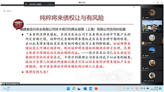讲座中,朱晓喆教授从债权让与金融交易的三方当事人视角出发,分析了债权让与交易当中的基础关系,给大家讲解了债权让与的原因、法律性质、让与和处分行为的区别以及债权转让背后的法理涵义。他以福建省一例保理合同纠纷为例,结合我国《民法典》合同编545条等有关债权让与和保理合同的相关规定,深入地讲解了不得实施债权让与的法定情形、债权出让人的瑕疵担保义务。朱晓喆教授表示,债权出让人对于债权是否能够回收、债务人是否具有履行能力不负品质责任,同时,他认为对于虚假债权转让的受让人应当予以保护,并基于我国目前金融交易市场的环境,就我国资产证券化背景下纯粹将来债权让与的保护问题探讨了两种可行模式:一是借鉴德国的立法,形成信赖保护模式;二是从侵权角度寻求救济。最后,朱晓喆教授鼓励同学们能多运用案例去理解法律条文。