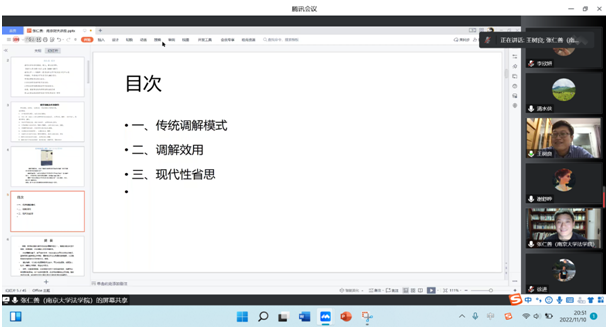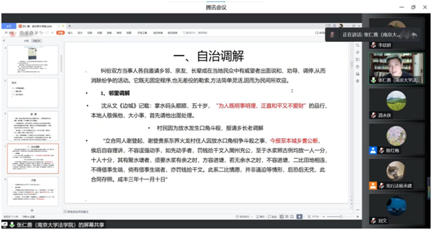 2022年11月10日晚,南京大学7790必发集团张仁善教授应邀为我院师生作了主题为“传统纠纷调解模式、效用及现代性省思”的讲座,此次讲座是我院法学教育二十五周年的系列庆祝活动之一。讲座采用线上方式(腾讯会议)举行,我院陈红梅副院长出席本次讲座。会议由我院夏清瑕教授主持,我院青年教师徐进博士、谢舒晔博士、王树良博士担任与谈人,180多名学院师生在线听讲。